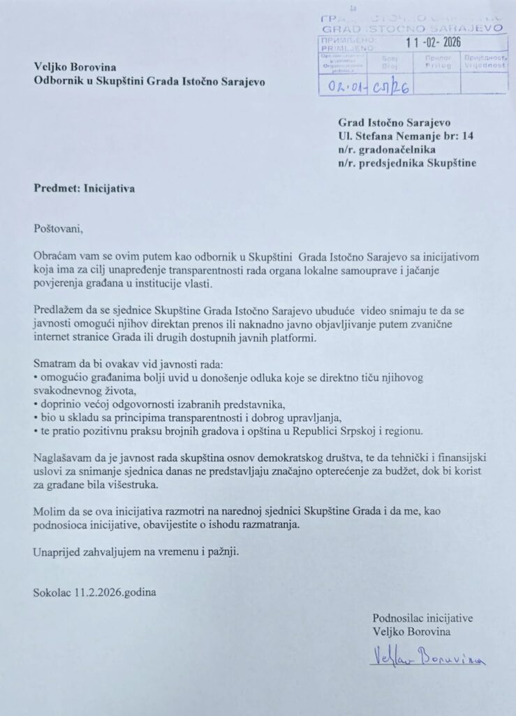 Дана 18.2.2026. године одржана је 8. редовна сједница Скупштине Града Источно Сарајево, на којој је одборник из Покретa Сигурна Српска, Вељко Боровина из Сокоца, поднио иницијативу за увођење директних преноса и видео снимања сједница Скупштине Града Источно Сарајево 11.02.2026. године.